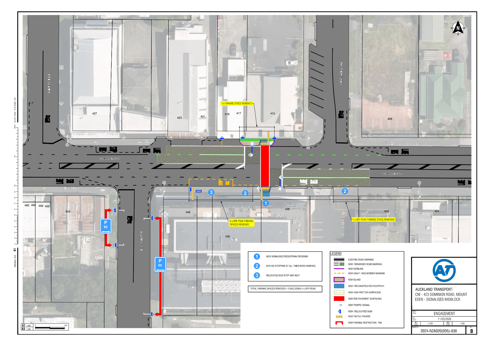 The project proposes installing a new signalised crossing across 423 Dominion Road, along with new high‑friction surfacing and a relocated bus stop aligned with the new crossing to improve overall safety and accessibility. As a result, a total of five parking spaces will be removed, and a P60 time restriction will be introduced on Herbert Road.