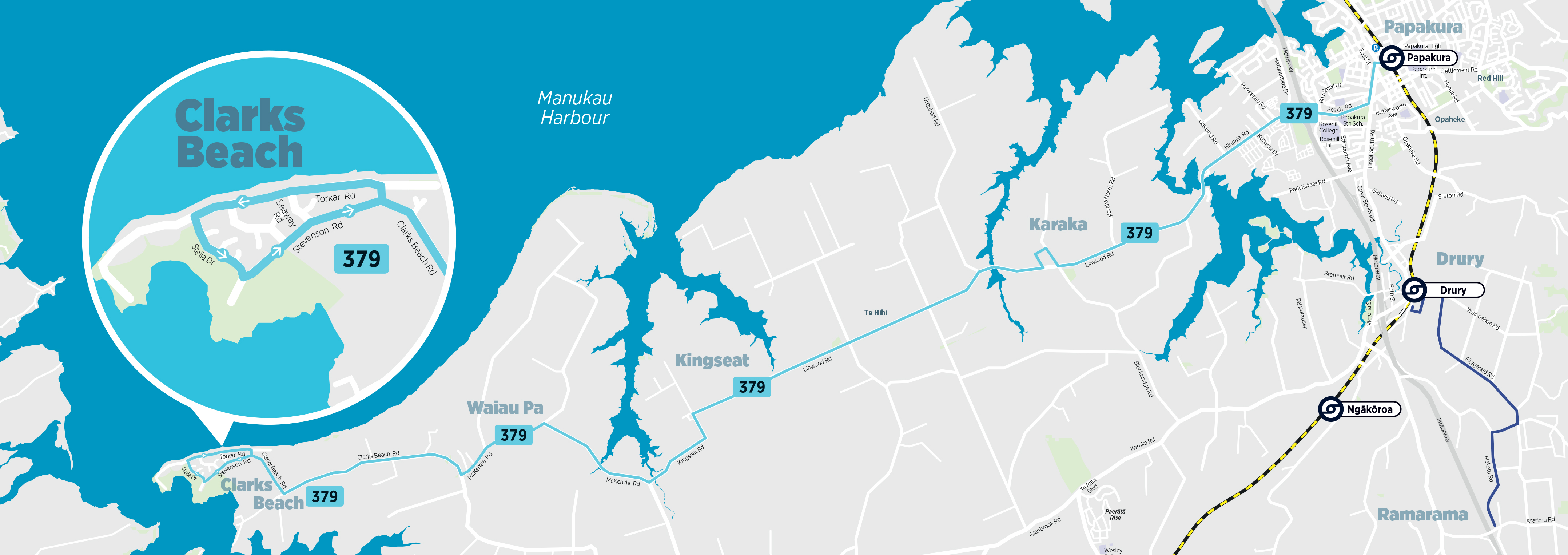 As a result of feedback, the 379 will serve Clarks Beach via a one-way anticlockwise loop using Torkar Rd, Stella Dr and Stevenson Rd. We have also added an additional trip from Clarks Beach during the weekday morning peak, and brought the first weekday morning departure from Clarks Beach forward by 10 minutes, to 5:20am.