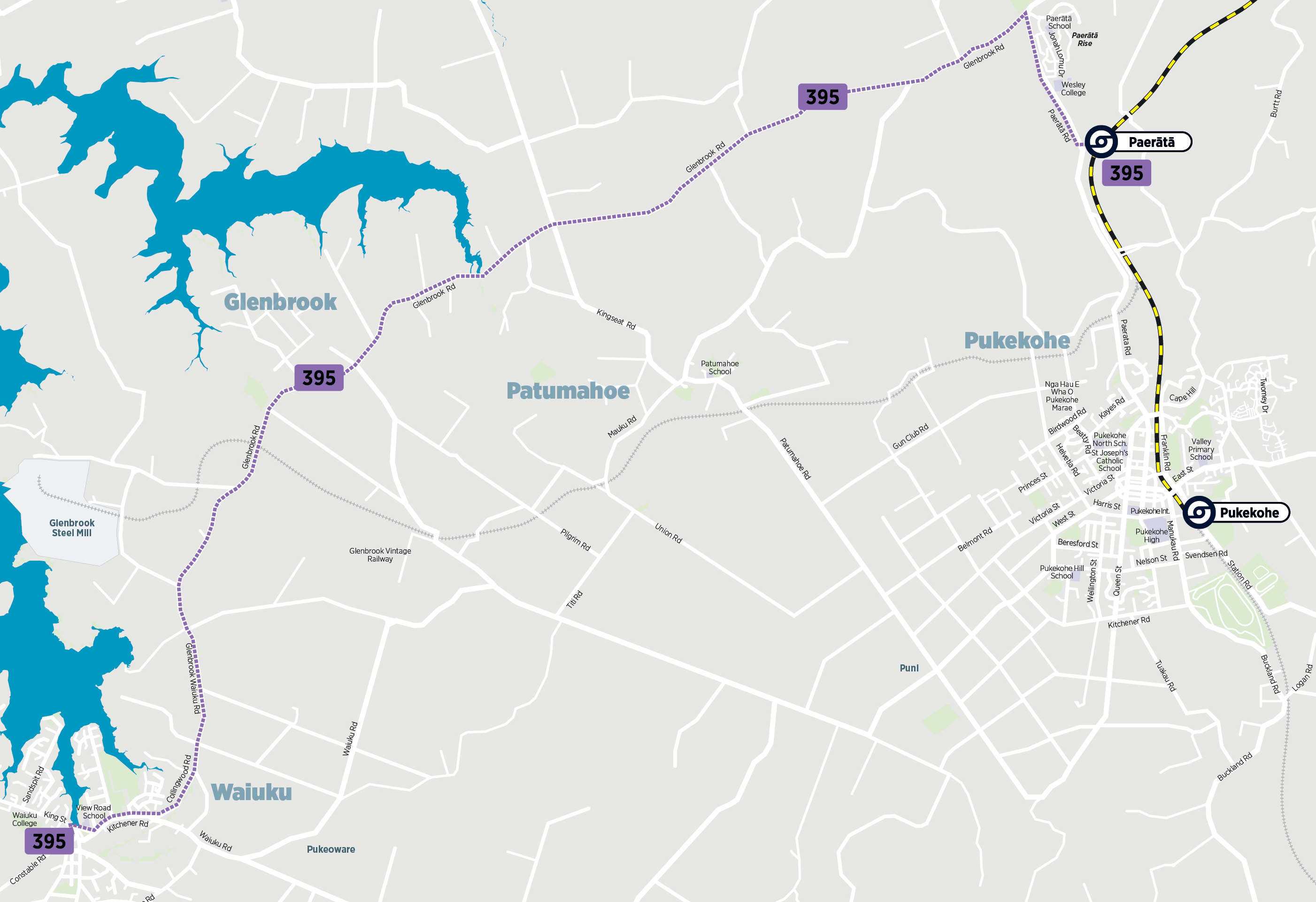 We’re proposing to change the 395 route so that buses run between Waiuku, Glenbrook and Paerātā Station. The 395 would no longer serve Kingseat, Te Hihi, Karaka or Papakura as it does today; these areas would be served by the new 379 bus route instead.