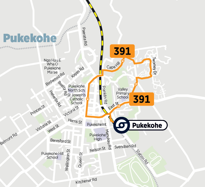 We’re proposing a new timetable for the 391. Compared with today, buses would run more often at peak commuting times on weekdays, but less often at all other times. Buses would be timed to connect with AT trains at Pukekohe Station.