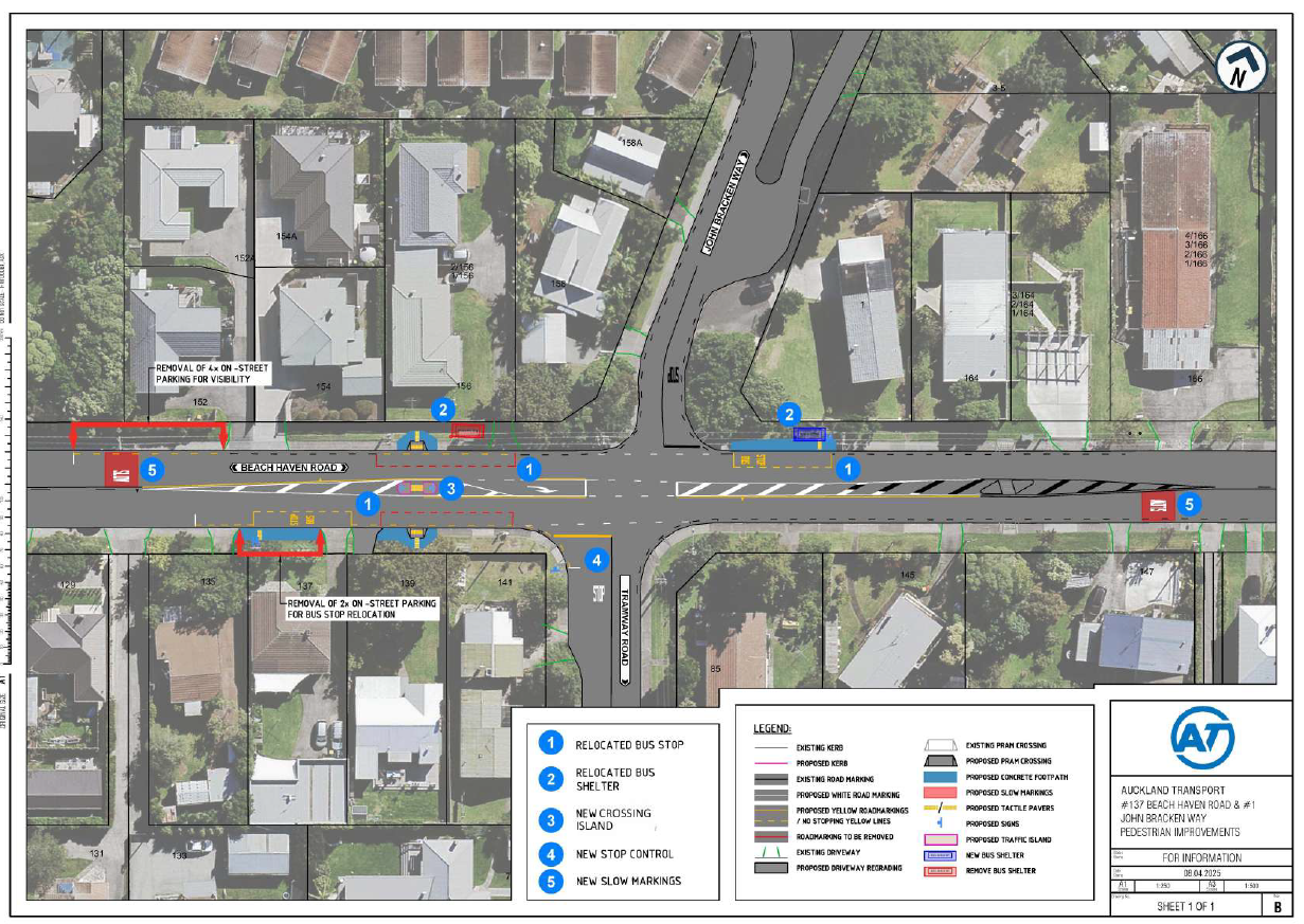 Move bus stop and bus shelter number 4160 from outside 156 Beach Haven Road to 1 John Bracken Way. We will need to clear access and visibility to allow buses to safely enter and exit the relocated bus stop by reallocating road space and removing 4 parking spaces outside 152 Beach Haven Road