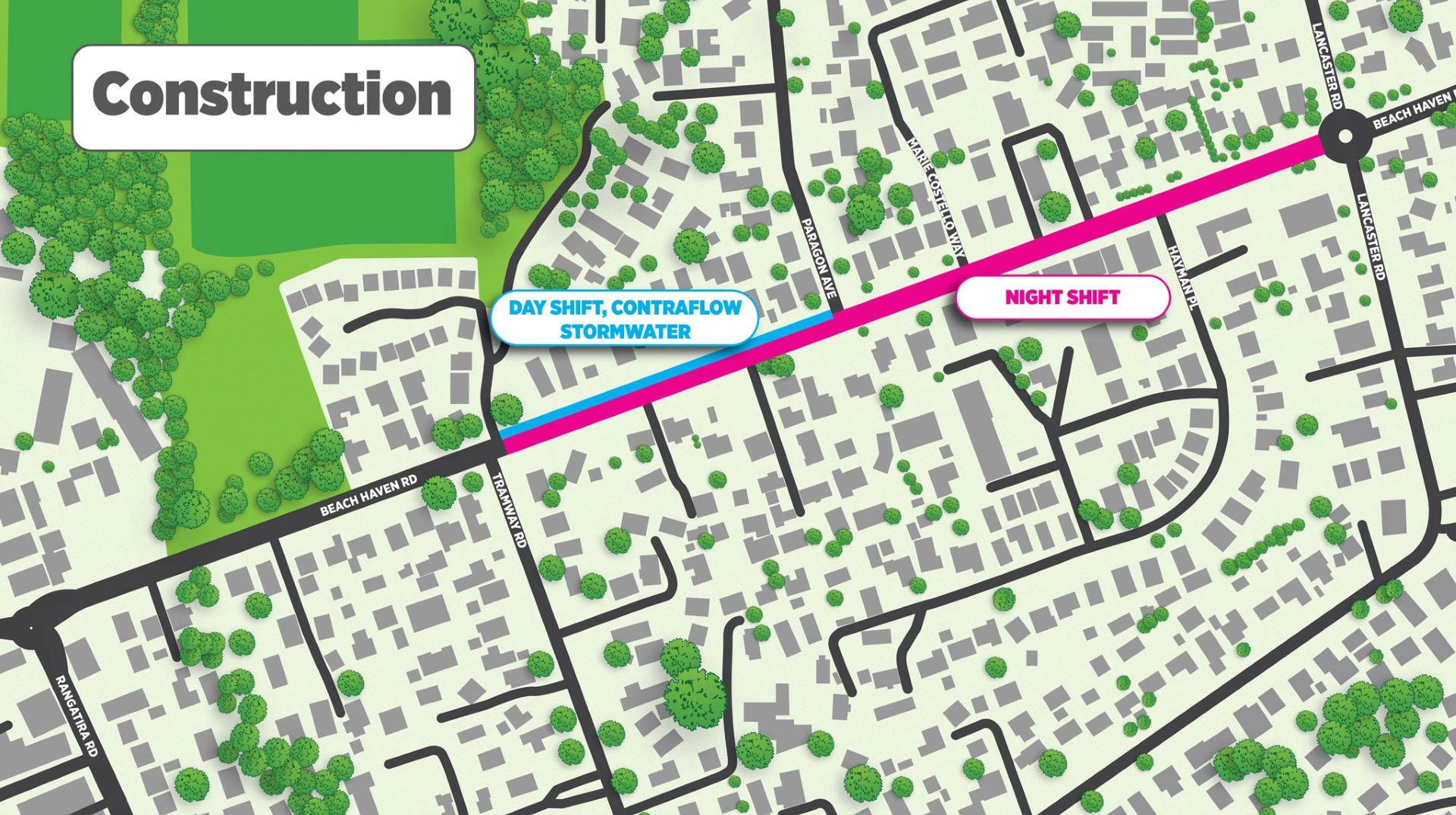 With only partial road closures through all stages of this road renewal, no detours or bus route changes will occur during Stop/Go or Contraflow traffic management on Beach Haven Road.