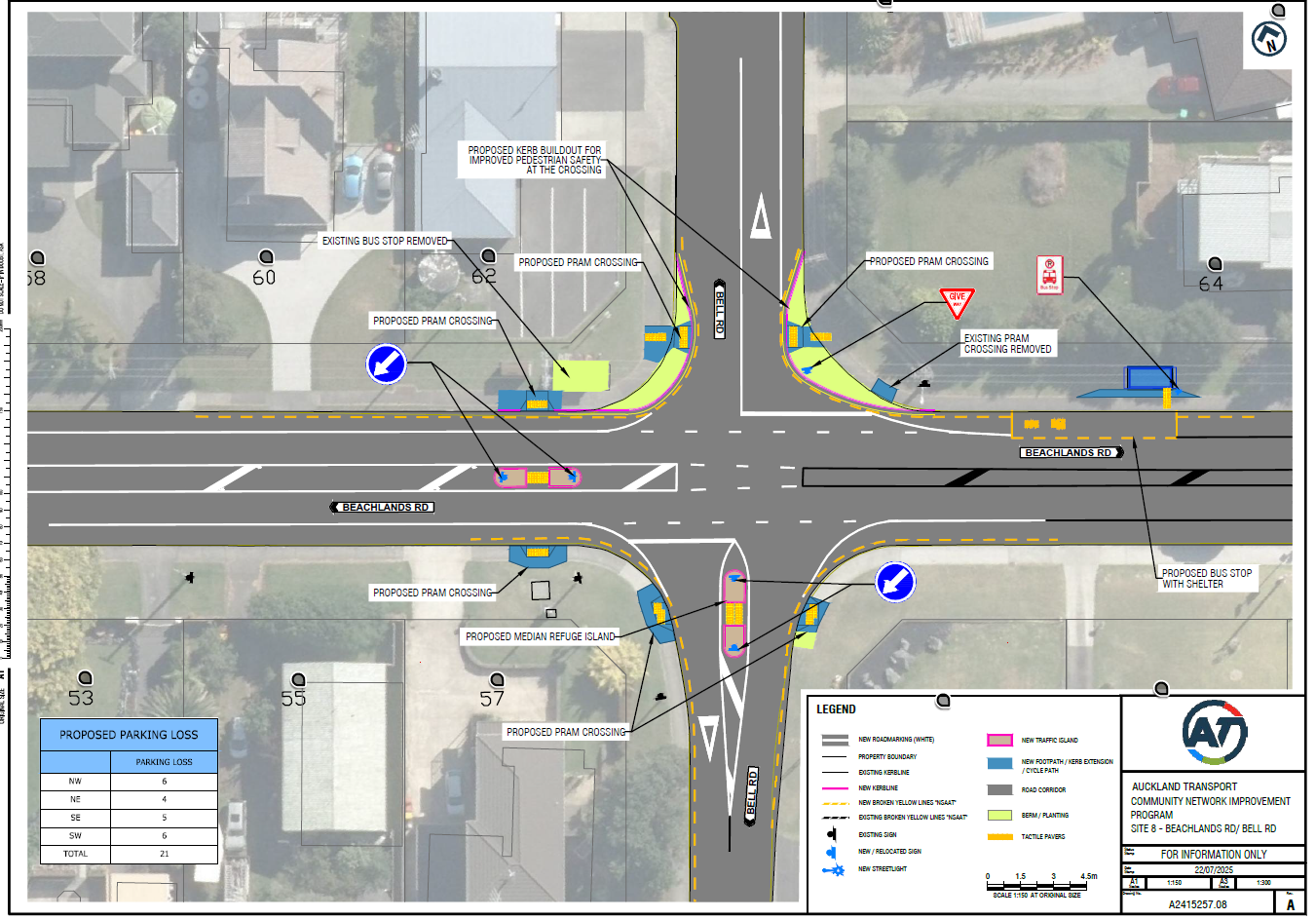 • Twenty-one parking spaces around the intersection on Bell Road and Beachlands Road will be converted to no-parking area and marked with broken yellow lines (no-stopping-at-all-times) to maintain visibility and keep crossing points clear.