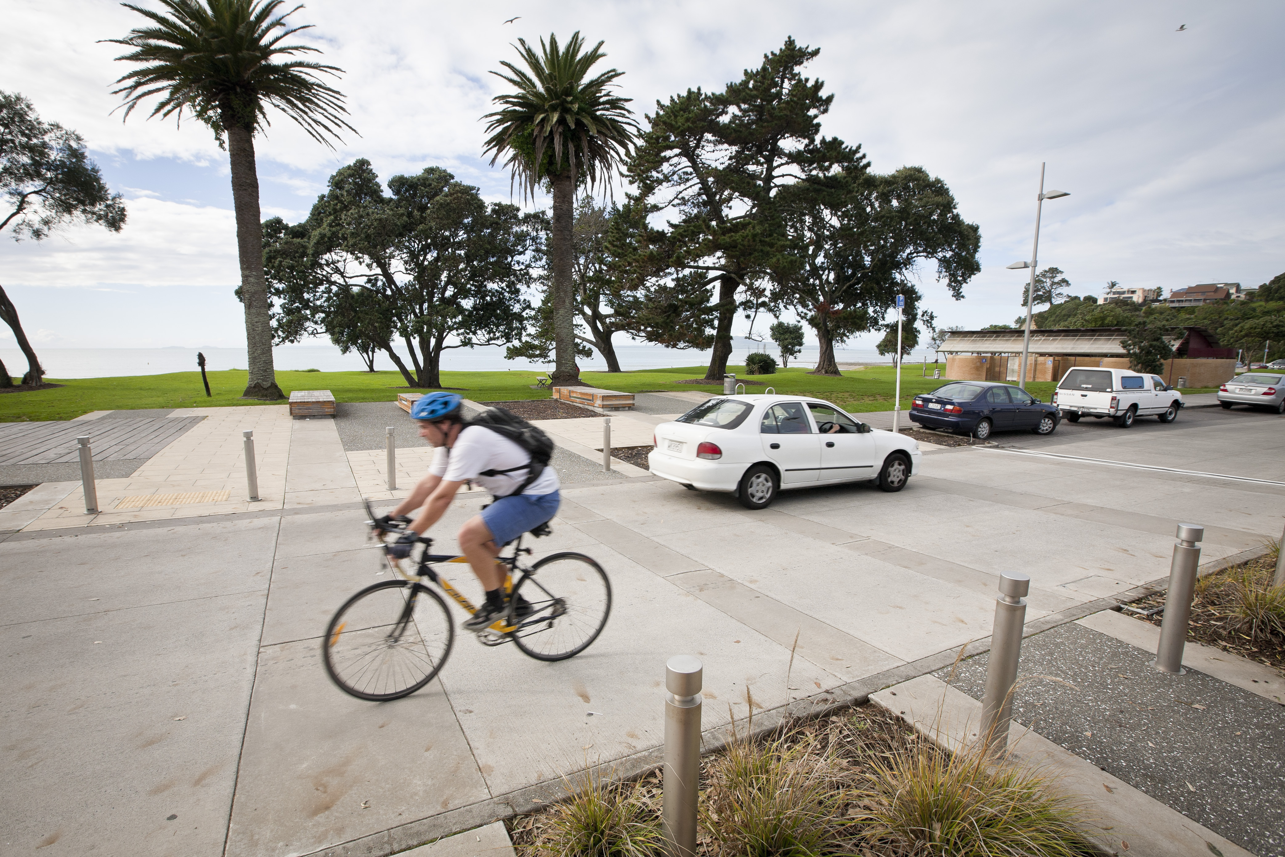 Person enjoy cycling near the waterfront in Browns Bay Town Centre