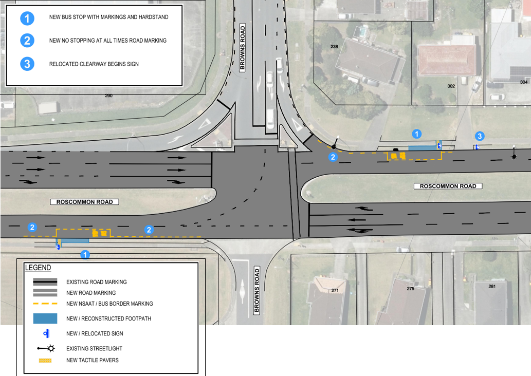 We are proposing to put in one new pair of bus stops at 267 & 302 Roscommon Rd. The exact locations of these new bus stops are shown below. (These and other drawings are also downloadable as a PDF in the documents to the right, labelled "Roscommon Road bus stops.pdf".)
