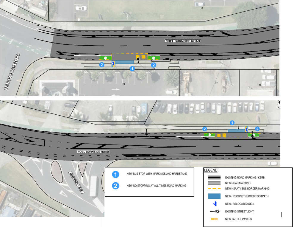 We are proposing to put in one new pair of bus stops on Noel Burnside Road. The exact locations of these new bus stops are shown below. (These and other drawings are also downloadable as a PDF in the documents to the right, labelled "Noel Burnside Road bus stops.pdf".)