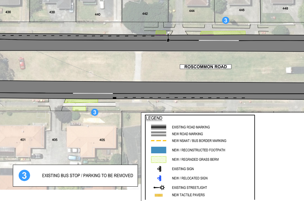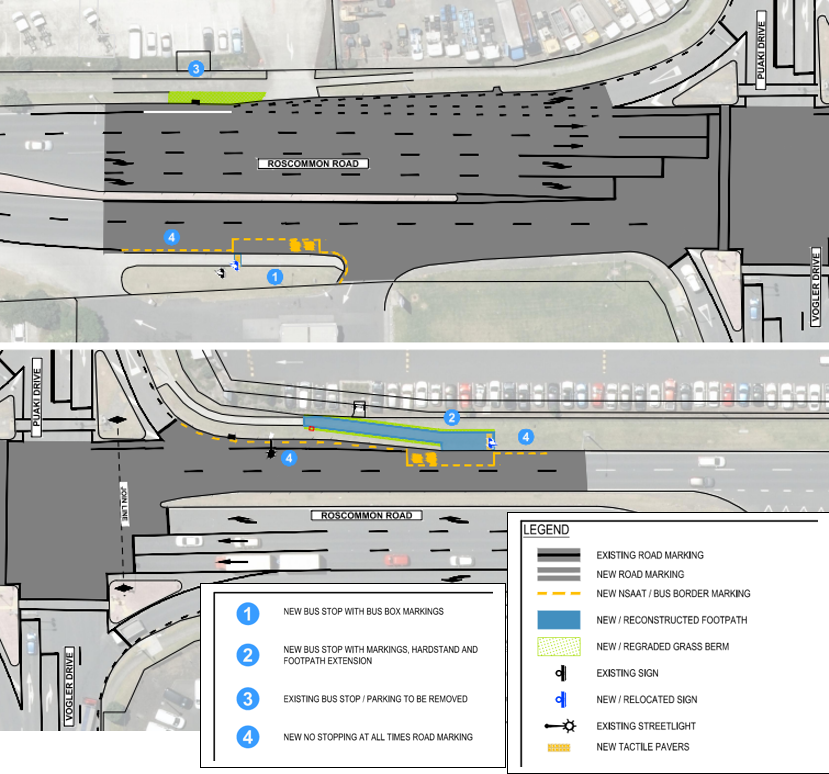 The exact locations of these new bus stops are shown below. (These and other drawings are also downloadable as a PDF in the documents to the right, labelled "Roscommon Road bus stops.pdf".)