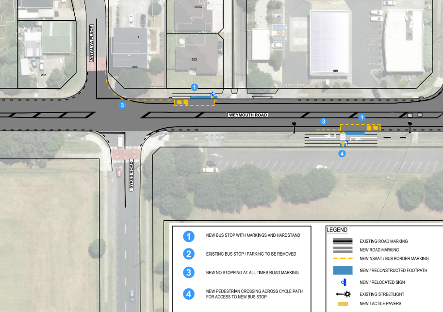 Image 1 (above) shows the proposed location of two new bus stops at 203 and opp 199 Weymouth Road, alongside Mountford Park.