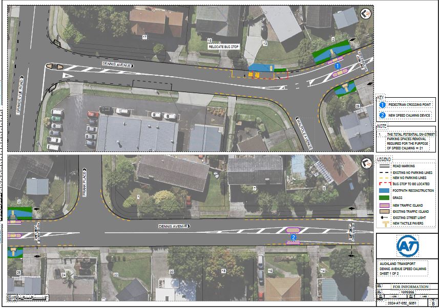 - Install pedestrian islands at #26 Dennis Avenue and #3 Dennis Avenue. These crossing points were at the request of the Manurewa Local Board to provide better connection to Nathan Homestead.