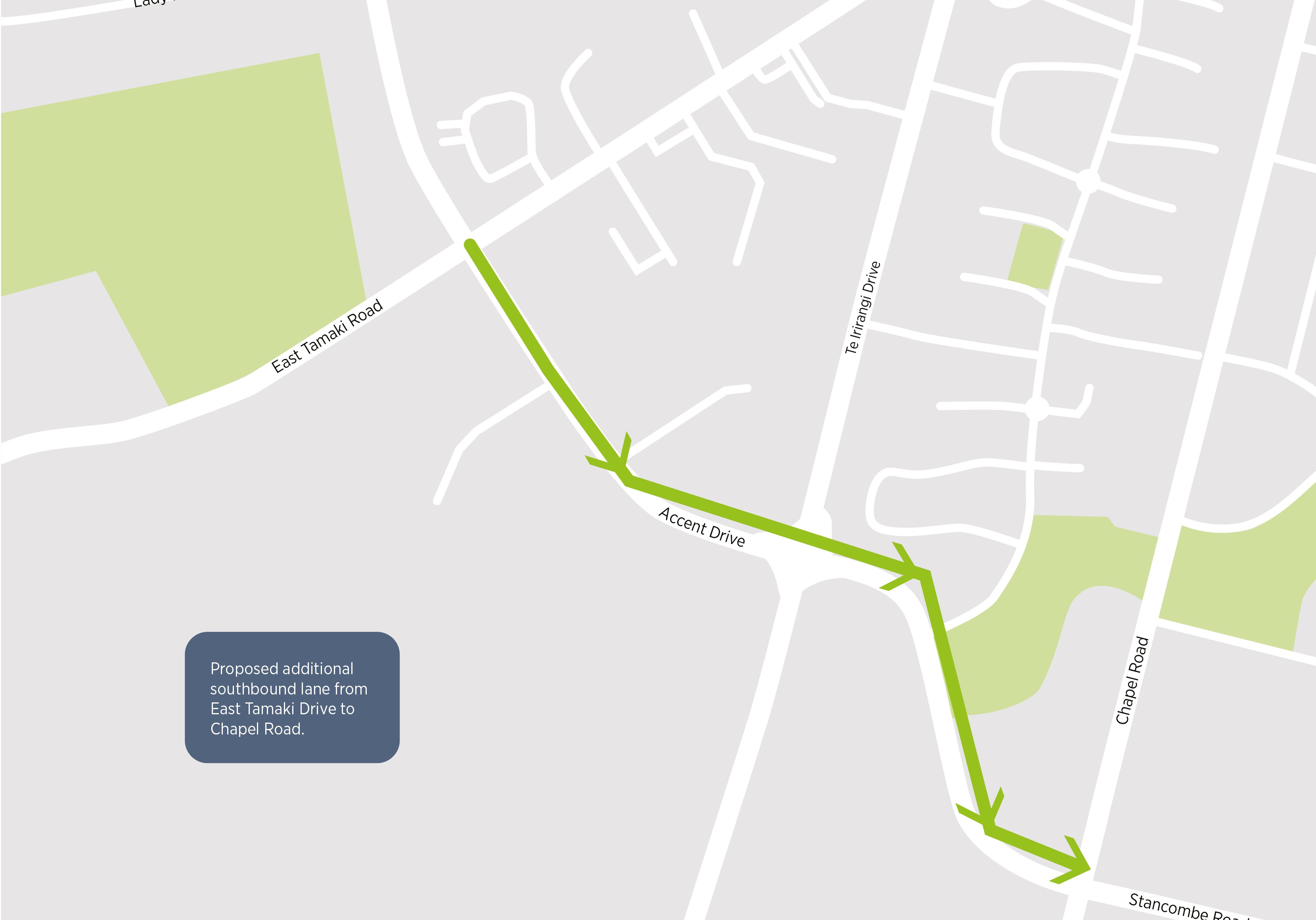 Create an additional southbound lane along Accent Drive, from East Tamaki Road to Chapel Road, by narrowing parts of the existing median.