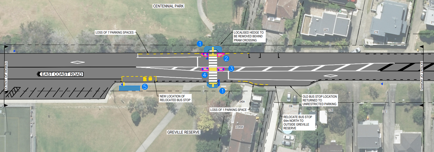 Reallocation of road space will result in a loss of seven parking spaces on the Centennial Park side and one space on the Greville Reserve side for visibility of people crossing.