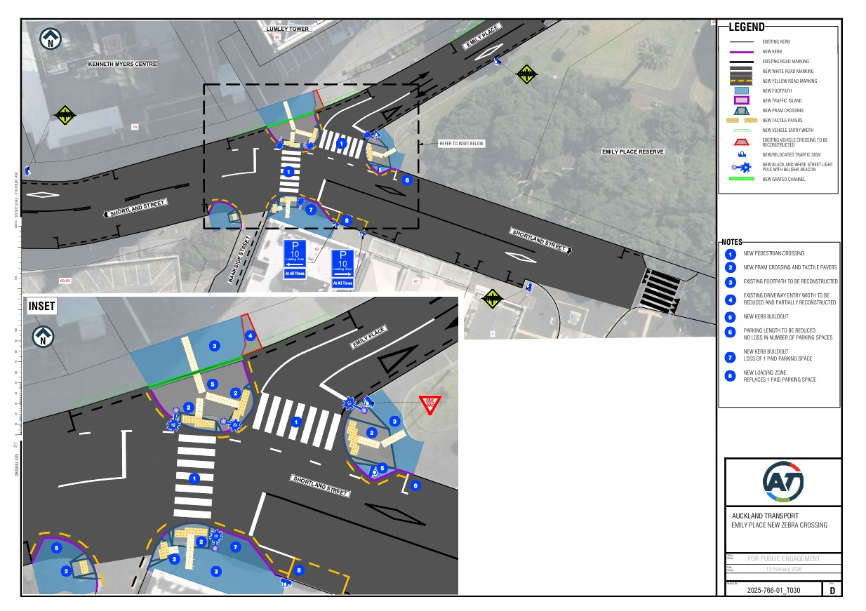 Thanks to funding from the Waitematā Local Board Transport Capital Fund, we are planning to install two new crossings on Emily Place and Shortland Street, and we’d like to know your thoughts on our plans.