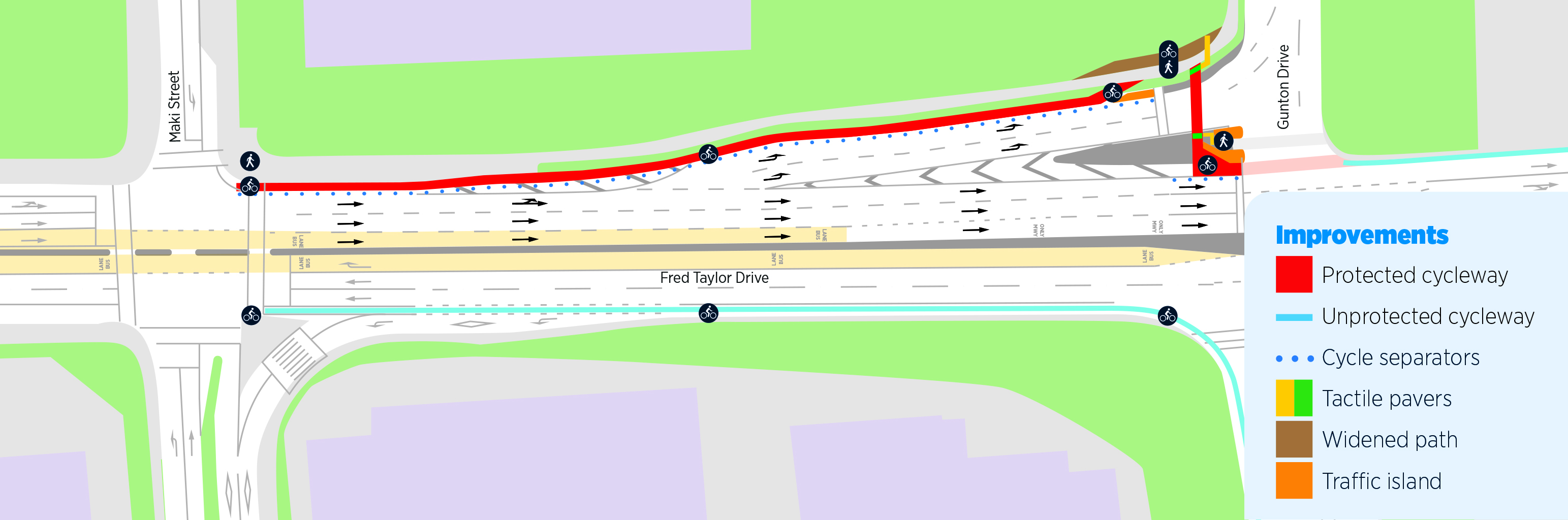 Enhanced safety – Moving the cycle lane from the centre to the left of the road and installing cycle separators provides a safer option for cyclists. Cyclists can also choose to use the traffic lane if that is their preference. Cycle lane separators will also be installed for cyclists waiting at the lights at Gunton Drive.