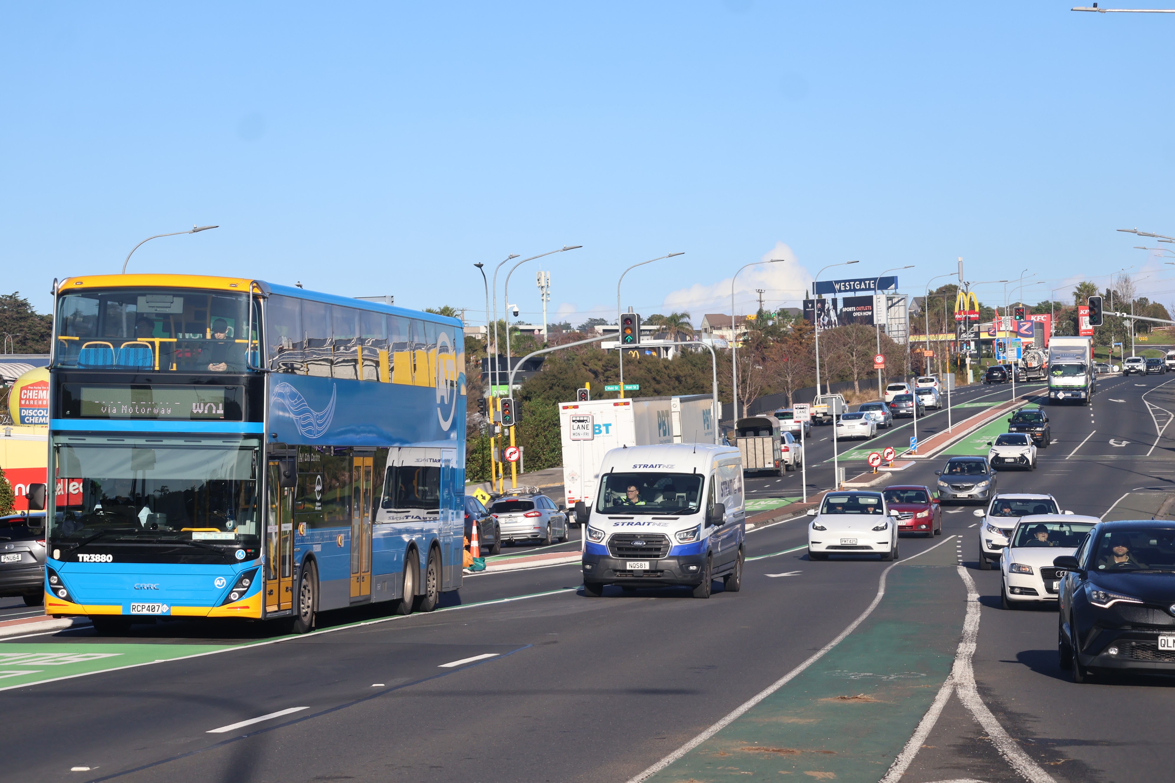 The bus lanes on Fred Taylor Drive support the reliability of the WX1 bus service to and from the central city, until the Northwest Busway - Te Ara Hauāuru is completed alongside SH16.