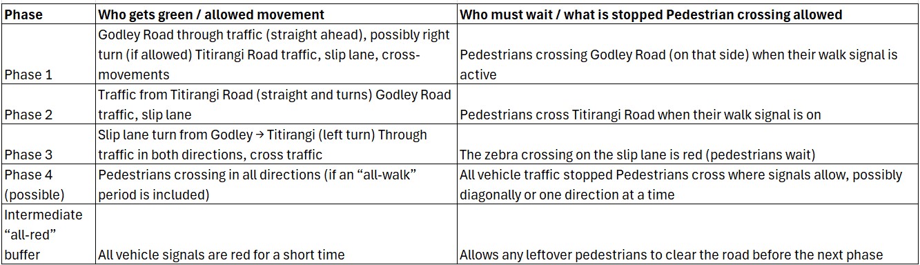 - Slip lane turn (Godley → Titirangi) – Vehicles turn left with a green arrow. During this time, the new zebra crossing on the slip lane is red.