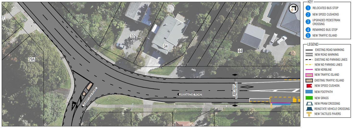 - To make space for the new crossing and bus stop, and to help buses move safely in and out without blocking driveways, we need to reallocate road space by removing 4 parking spaces — 1 outside #44 Greenhithe Road and 3 across the road at the new bus stop. This will also make it easier for people to see the crossing clearly.