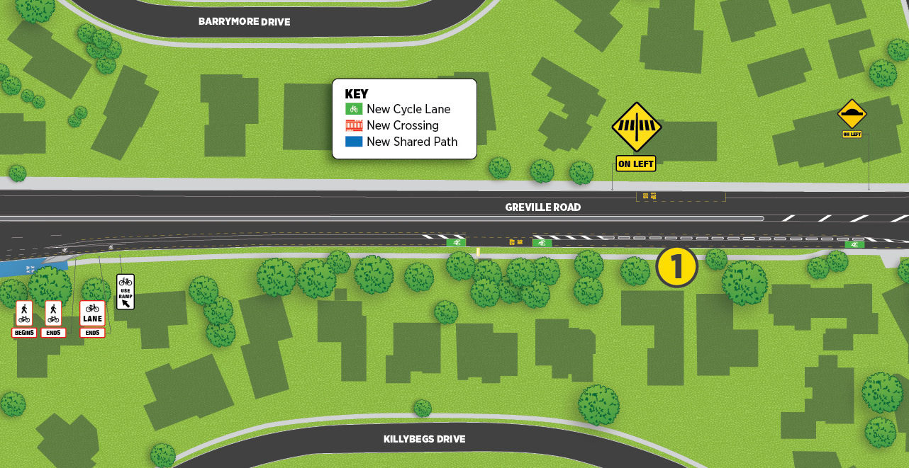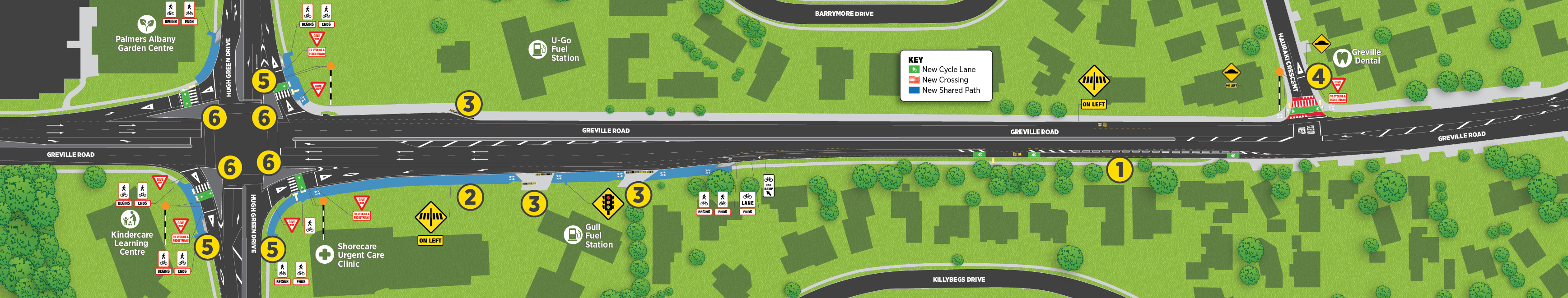 (2) A new shared path on the southern side of Greville Road (same side as the Gull), from Hugh Green Drive to just after Gull