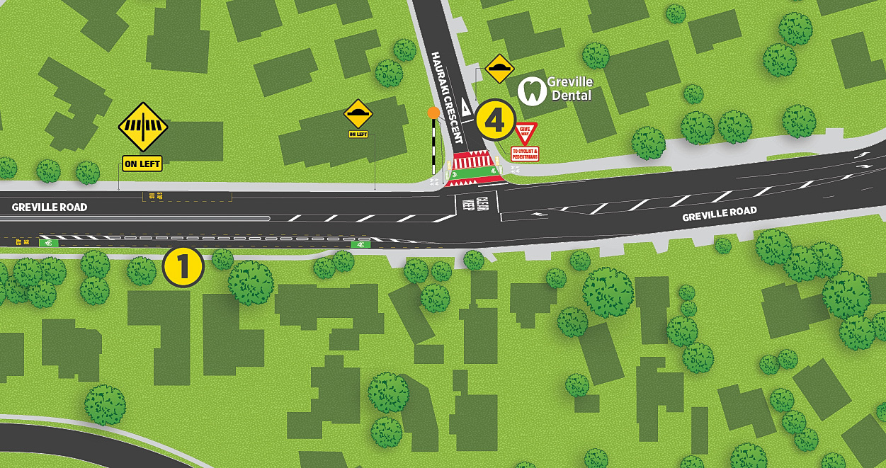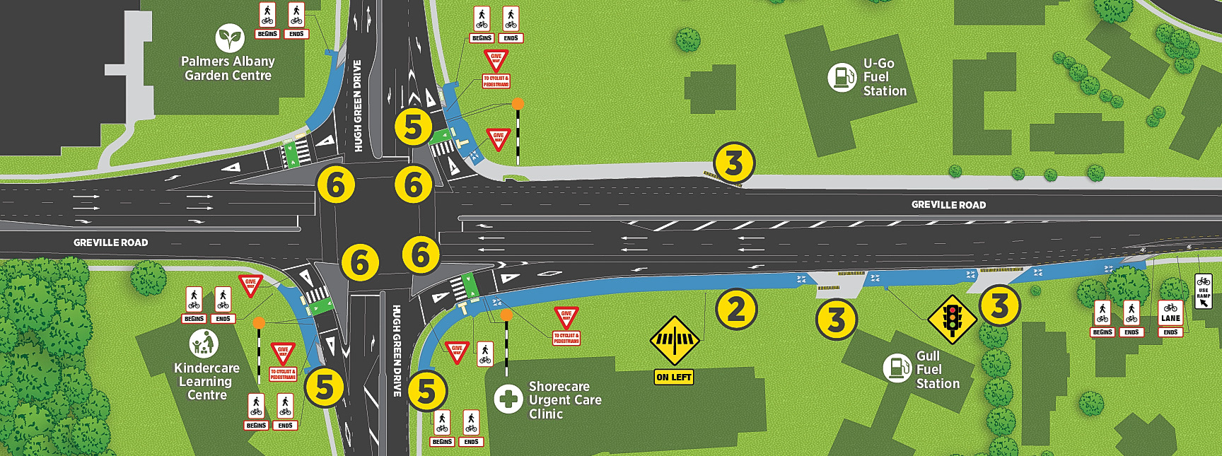 (6) Reshaping the traffic islands at the intersection of Hugh Green Drive and Greville Road to support paired crossings