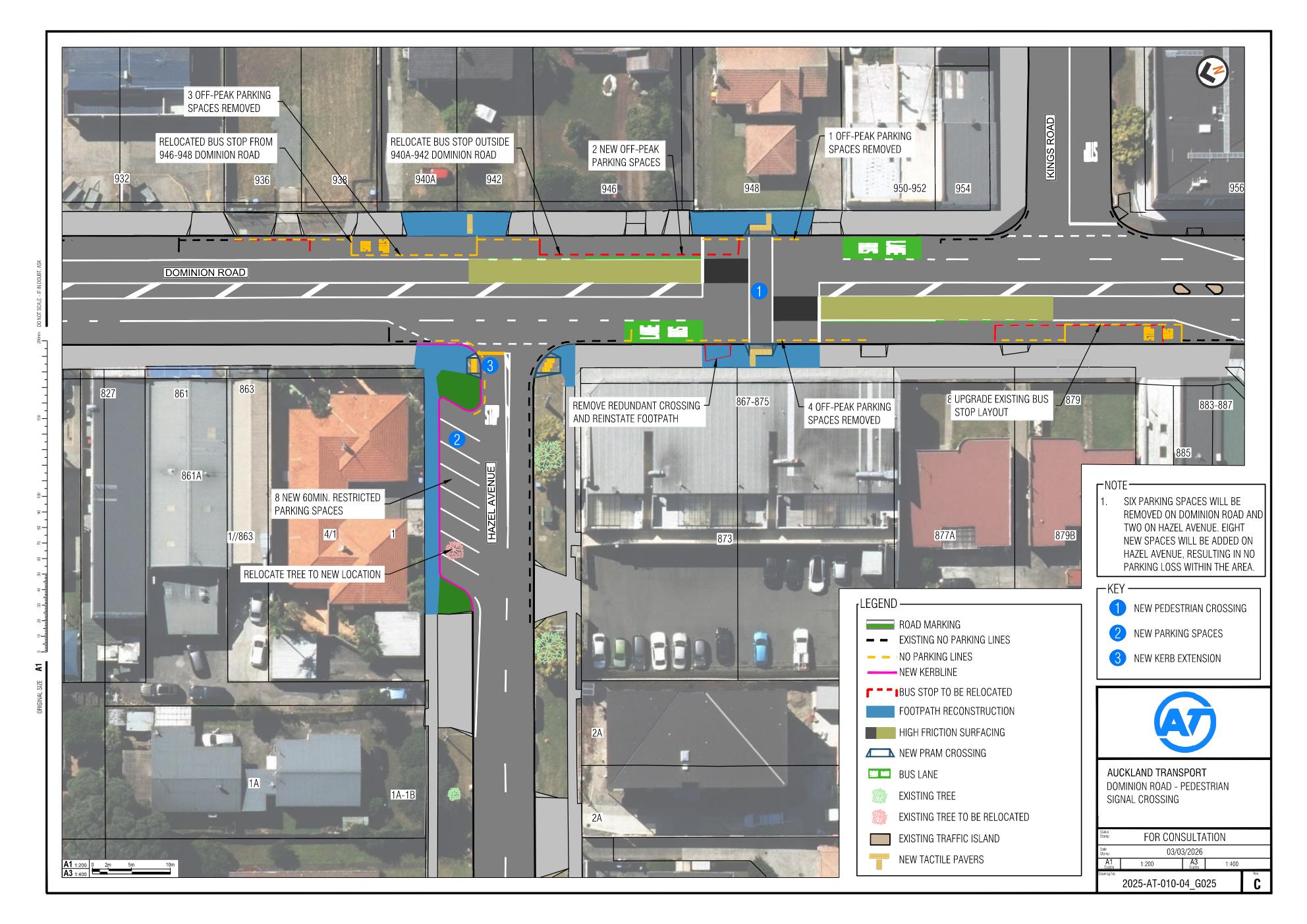 To address concerns from local businesses and the community about the removal of five on‑street parking spaces required to deliver the proposed mid‑block pedestrian crossing near 948 Dominion Road, we are planning to construct eight additional parking spaces on Hazel Avenue.
