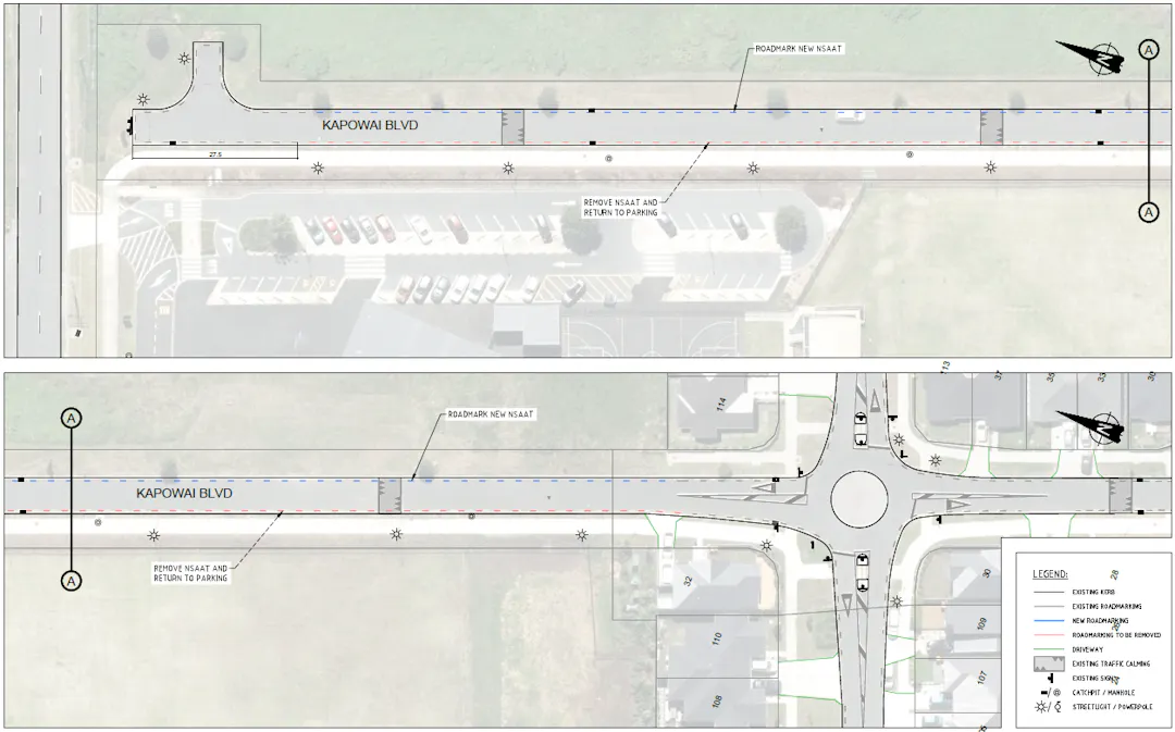 The “No stopping at all times” (broken yellow lines) will be moved from the western side of Kapowai Boulevard to the eastern side, near 139 Airfield Road, Takanini.