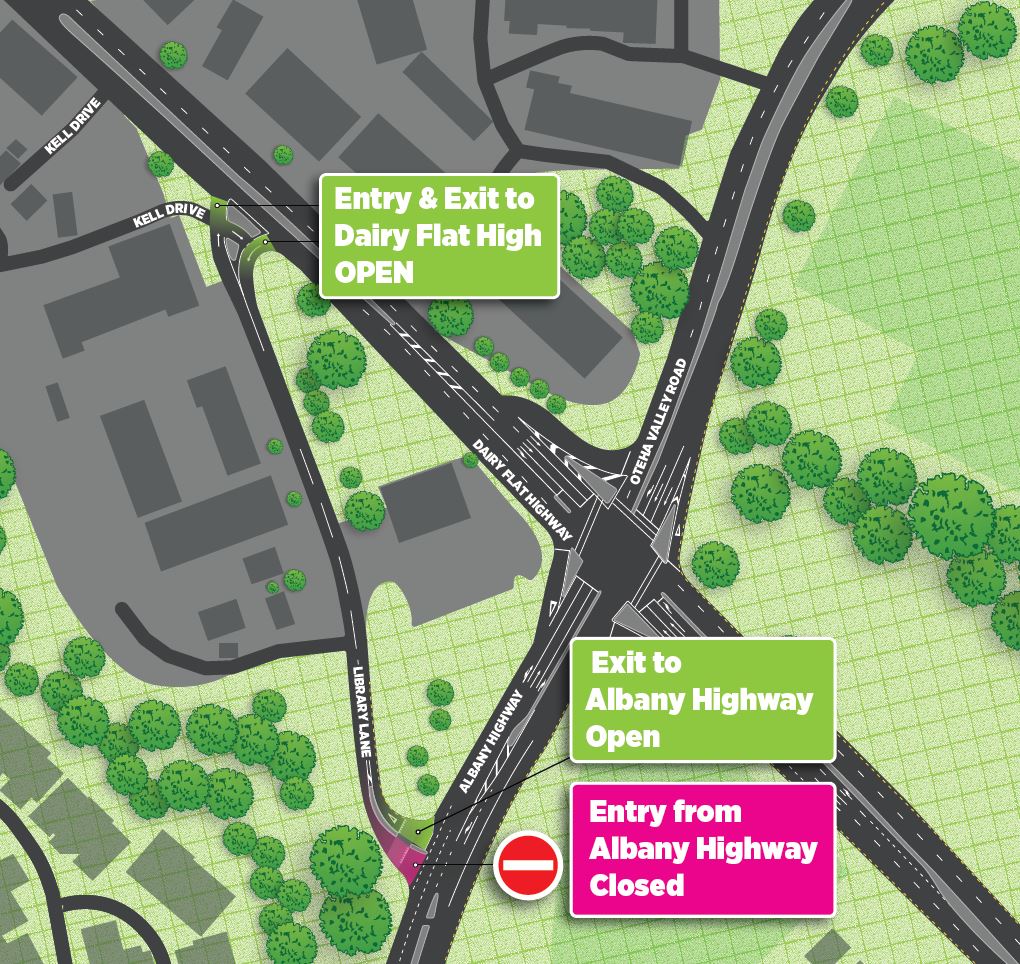 Library Lane exit onto Albany Highway and entry/exit to/from Dairy Flat Highway open during trial times