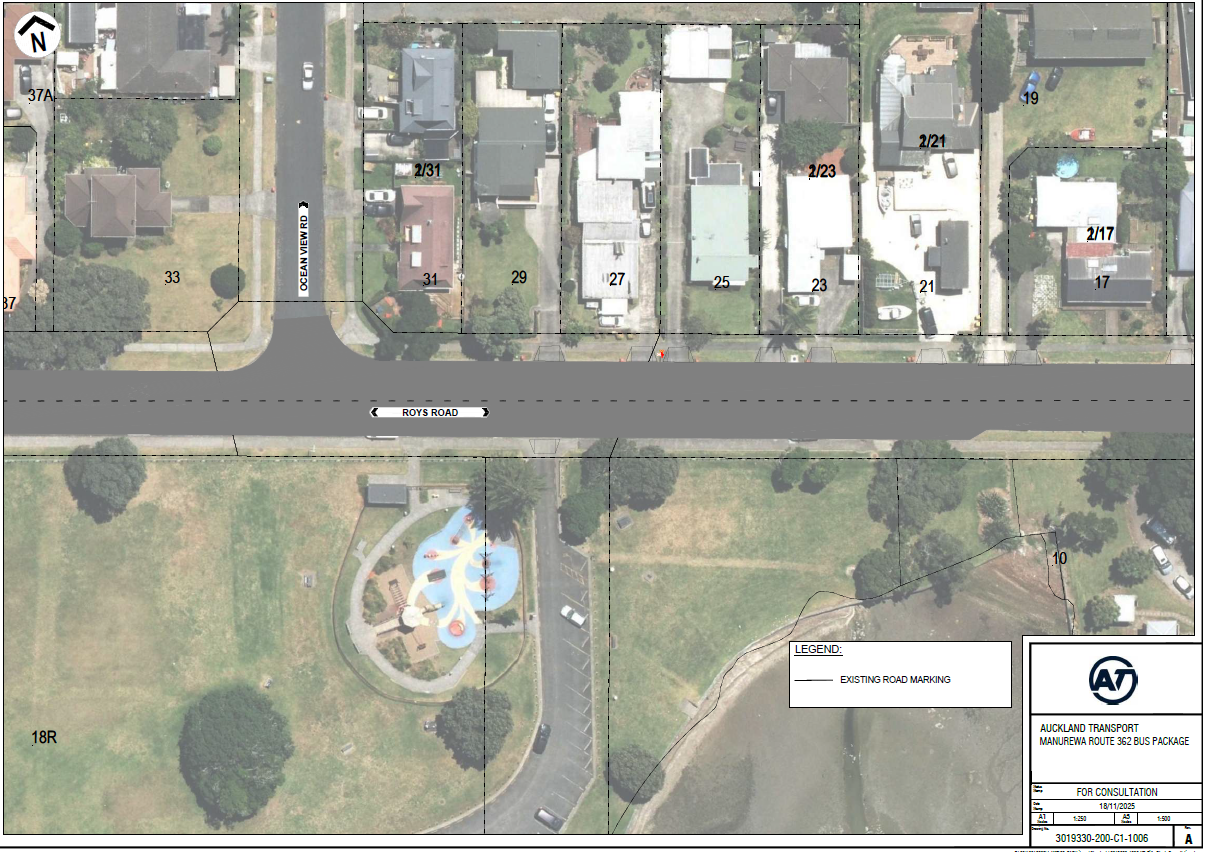 The image (above) shows the location of the road marking around the existing bus stop at 20 Waimai Avenue.