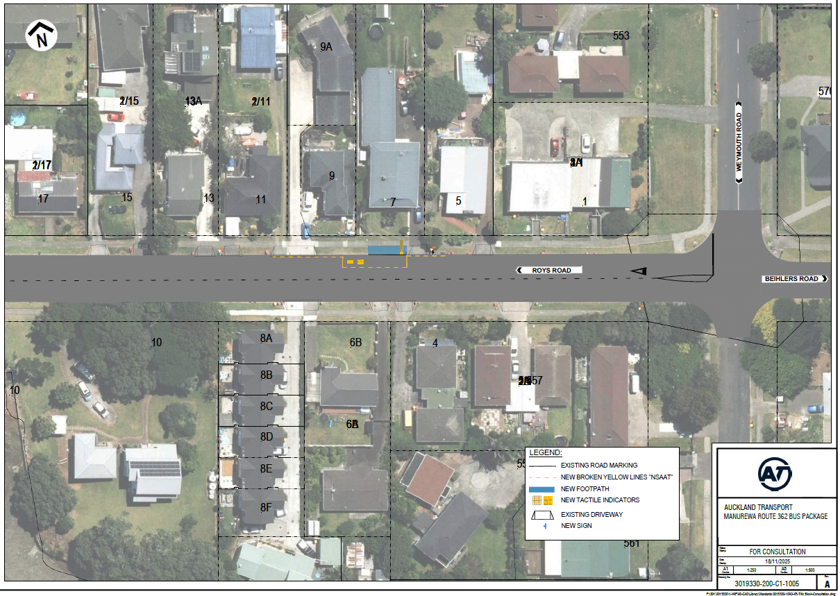 • We are proposing to paint road markings around the existing bus stop at 7 Roys Road and make improvements to the footpath. This includes painting broken yellow lines at the front and back of the bus stop to allow buses to safely enter and exit the bus stop.