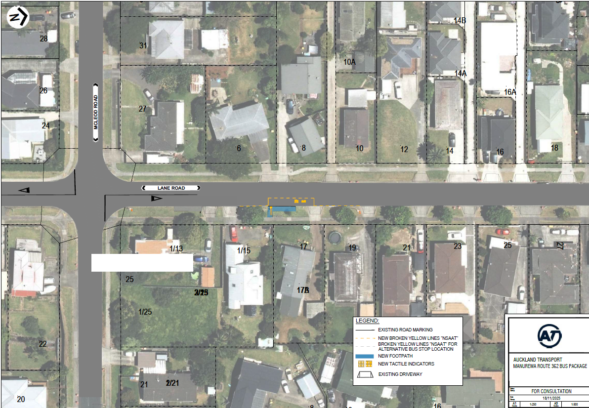 We are proposing to paint road markings around the existing bus stop at 17 Lane Road and make improvements to the footpath. This includes painting broken yellow lines at the front and back of the bus stop to allow buses to safely enter and exit the bus stop. See image below (This plan is also downloadable as a PDF in the documents to the right, labelled "Lane Road.pdf".)