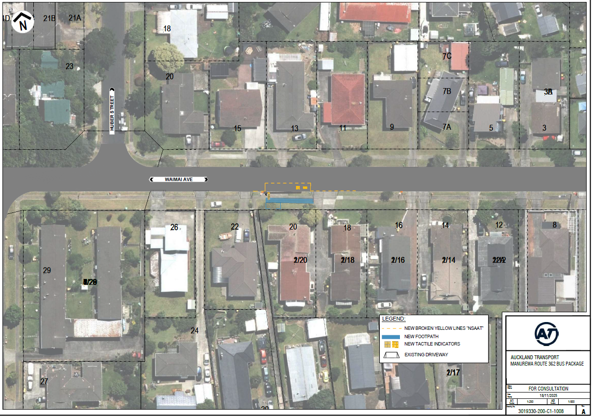 We are proposing to paint road markings around the existing bus stop at 20 Waimai Avenue and make improvements to the footpath. This includes painting broken yellow lines at the front and back of the bus stop to allow buses to safely enter and exit the bus stop. See image below (This plan is also downloadable as a PDF in the documents to the right, labelled "Waimai Avenue.pdf".)