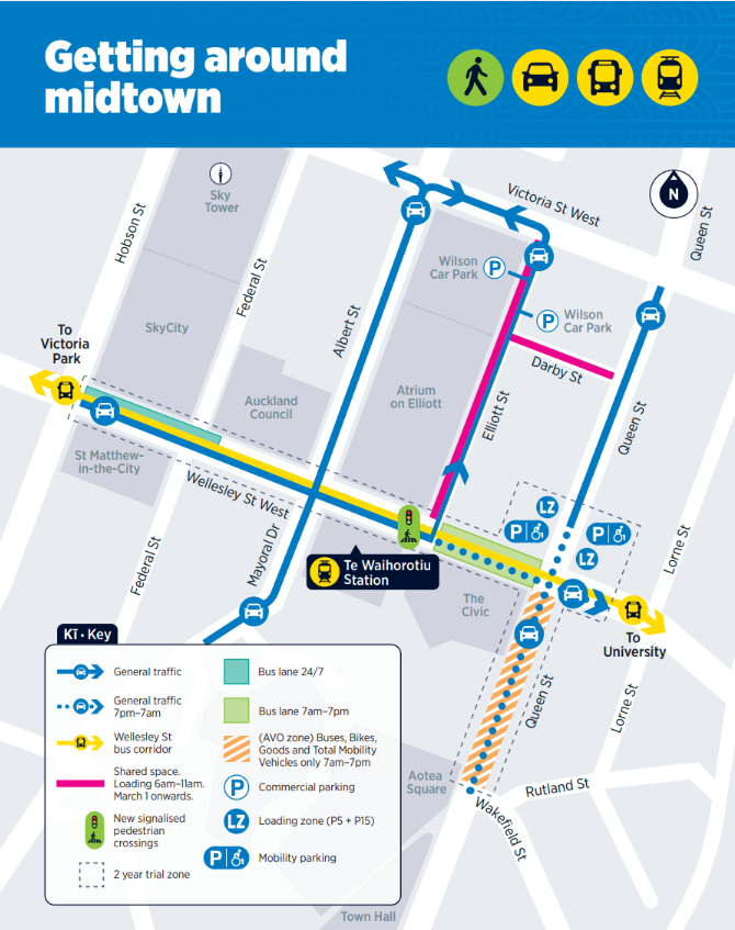 - We’re introducing bus lanes on both sides of Wellesley Street between Elliott Street and Queen Street. These lanes will prioritise buses from 7am to 7pm daily to enable faster, more reliable journeys.