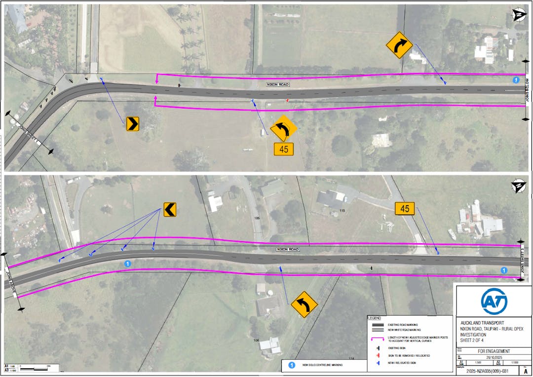 - Paint a solid white centreline between 105 – 248 on Nixon Road to clearly define the separation on traffic lanes along the bend.