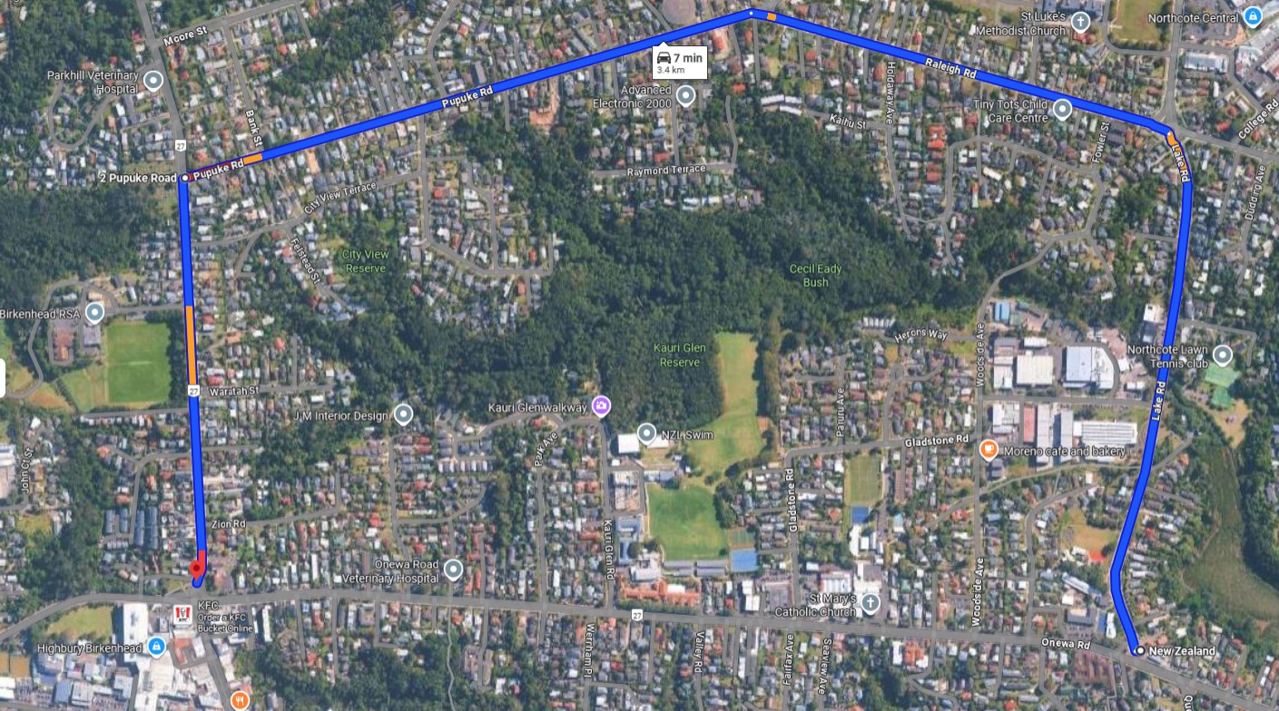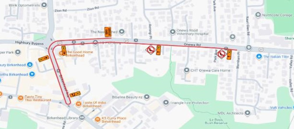Available alternative route - North on Birkenhead Ave, East on Pupuke Road, East on Raleigh Road, South on Lake Road and continue on Onewa Road.