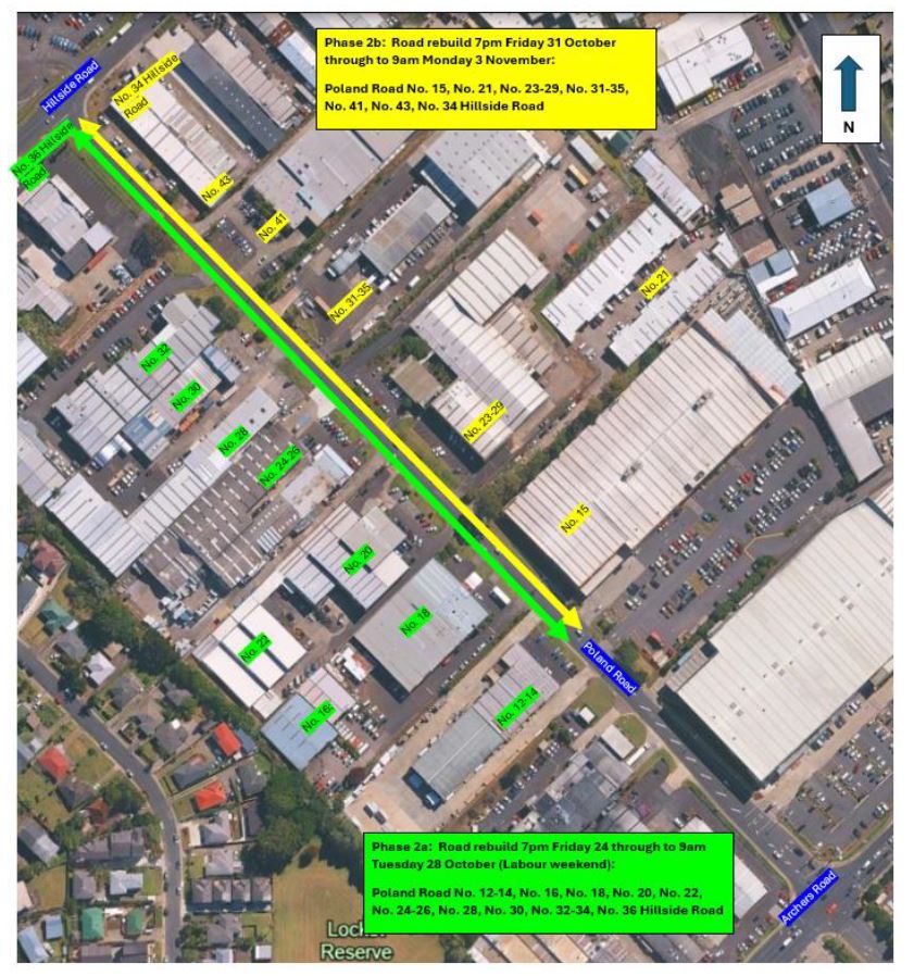 - Poland Road will be fully closed in both directions between Mitre 10 Mega and Hillside Road.