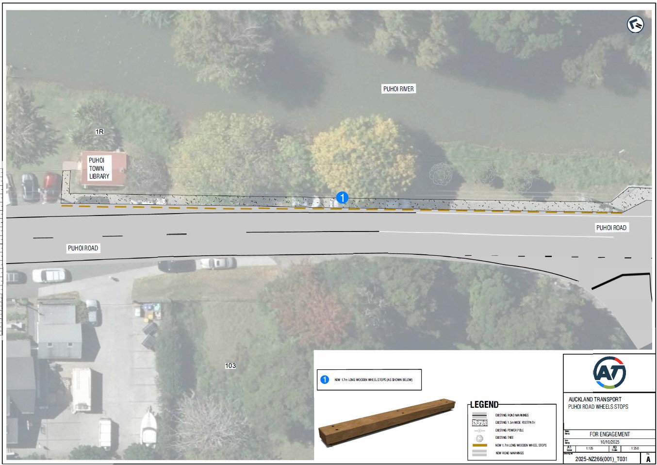 Install new wooden wheel stops on Puhoi Road between Puhoi Town Library and Bridge with minor road marking improvements.