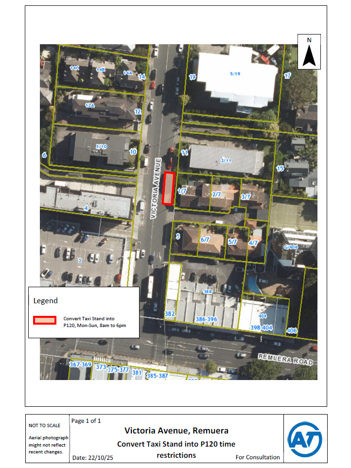 Share Victoria Avenue, Remuera - Convert Taxi Stand to P120 time restrictions on FacebookShare Victoria Avenue, Remuera - Convert Taxi Stand to P120 time restrictions on TwitterShare Victoria Avenue, Remuera - Convert Taxi Stand to P120 time restrictions on LinkedinEmail Victoria Avenue, Remuera - Convert Taxi Stand to P120 time restrictions link