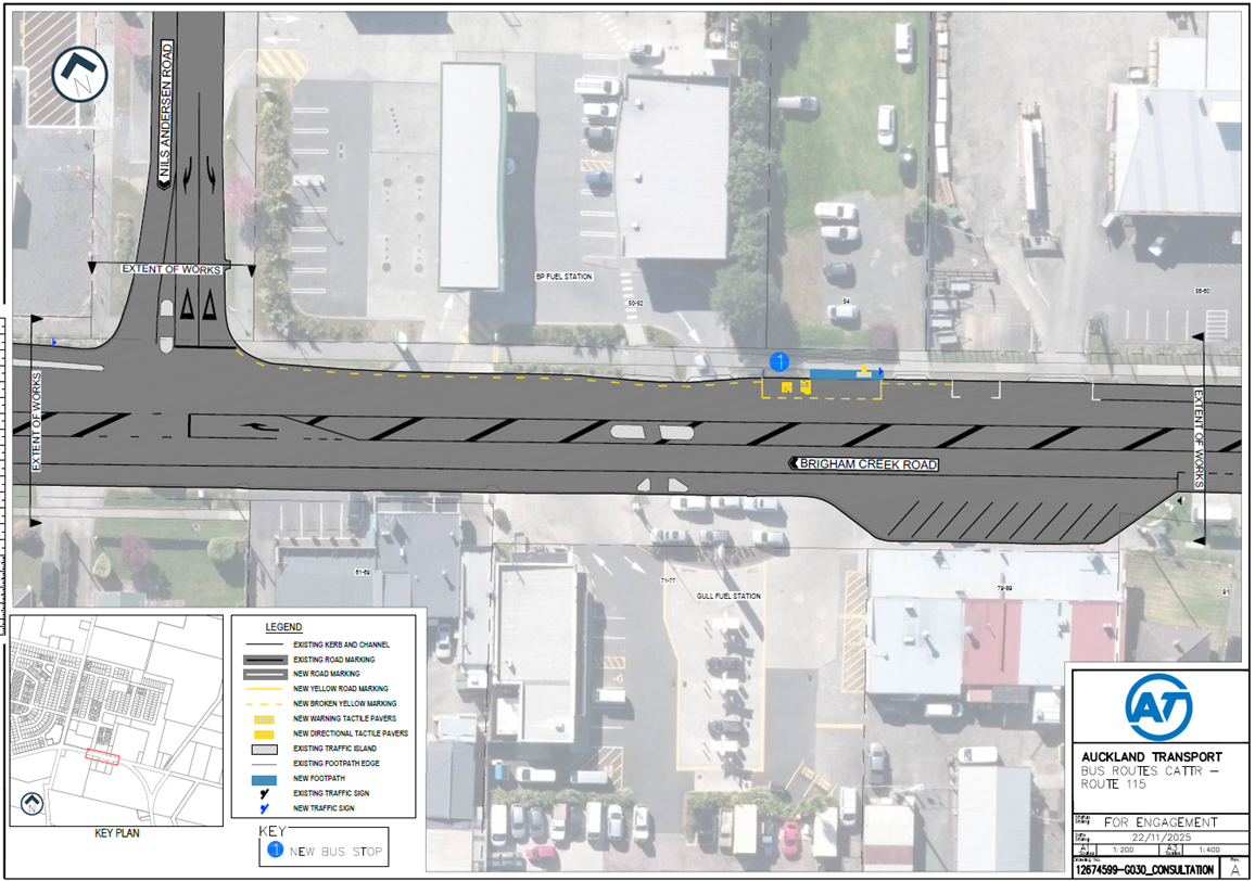 One new bus stop at 54 Brigham Creek Road near the BP, with broken yellow lines replacing on-street parking;